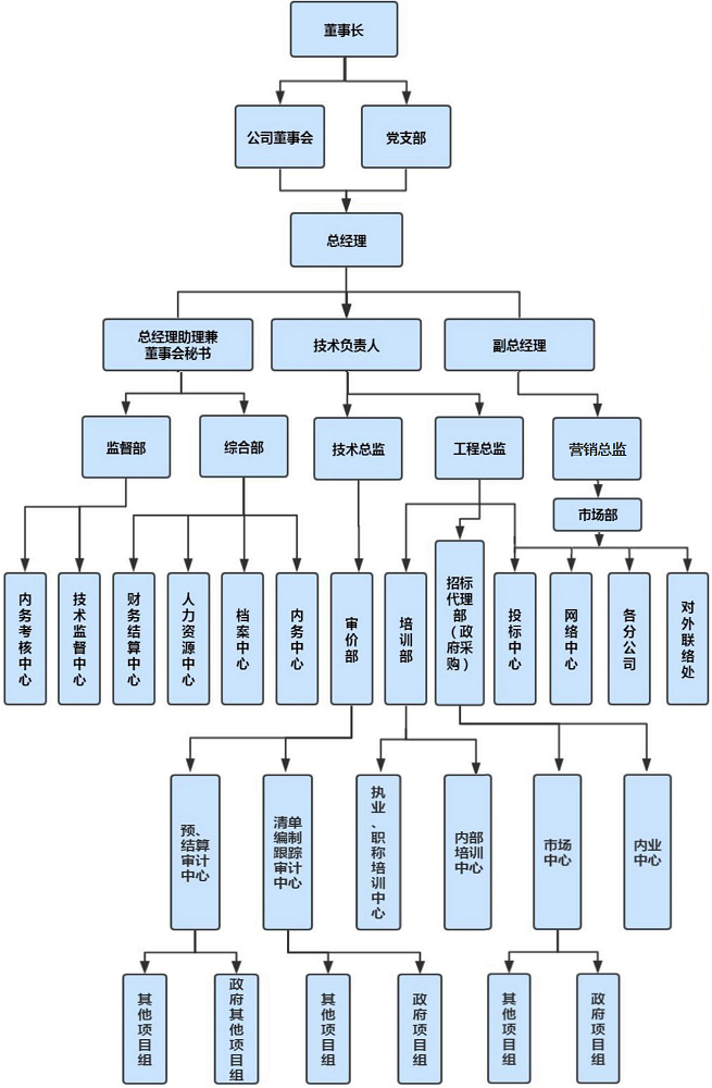 公司设有董事长、党支部书记室、总经办、总工室、营销中心;辖设综合部、市场、培训部、审价部、招标代理部、监督部以及所属各专业营运中心。在董事长(兼支部书记、总经理)统一领导下,配备总经理助理、副总经理、技术负责人、技术总监、工程总监、营销总监、审价部主任、招标代理部主任、办公室主任、财务经理、投标专员、档案管理专员等各级管理人员,技术力量雄厚,服务质量上乘。