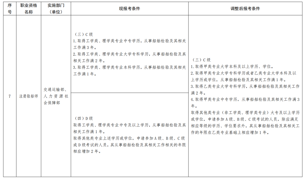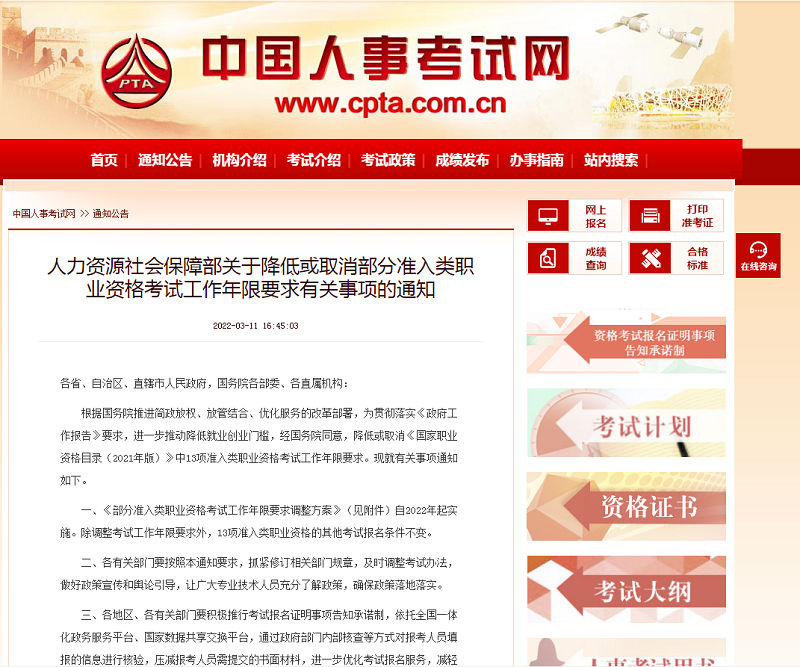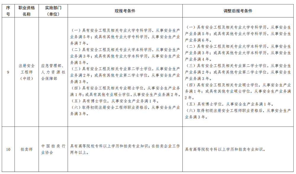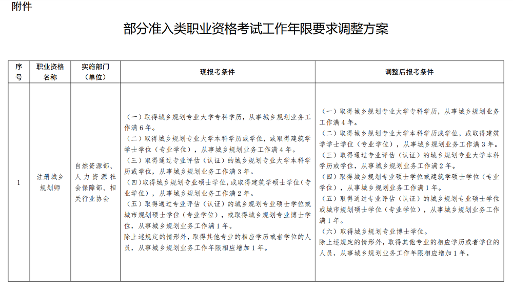 一、《部分准入类职业资格考试工作年限要求调整方案》(见附件)自2022年起实施。除调整考试工作年限要求外,13项准入类职业资格的其他考试报名条件不变。