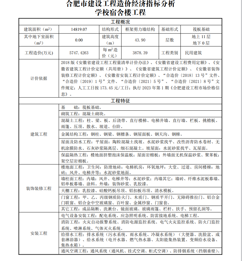 2023年2月合肥市建设工程造价经济指标分析--学校宿舍楼工程