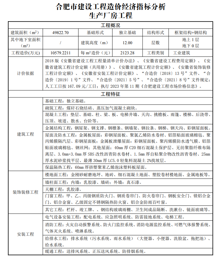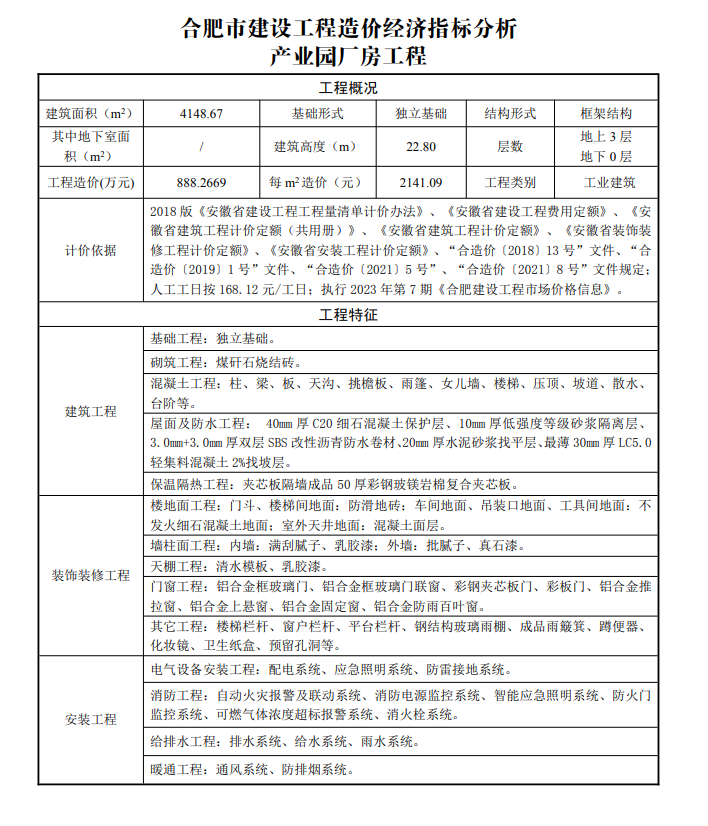 2023年8月合肥市建设工程造价经济指标分析--产业园厂房工程
