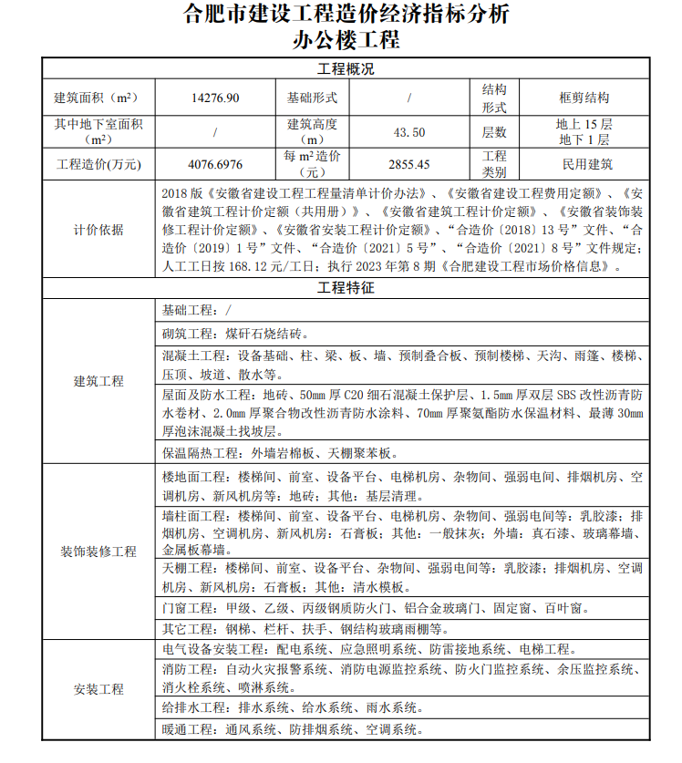2023年10月合肥市建设工程造价经济指标分析--办公楼工程