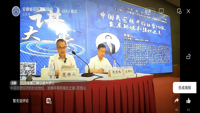 为深入学习贯彻习近平总书记关于民营经济发展的重要论述,全面贯彻《中华人民共和国民营经济促进法》,进一步提升我省各类市场主体对相关法规政策的理解与执行能力,推动我省民营经济高质量发展,安徽省发展改革委、安徽省招标采购协会2025年05月23日组织开展了“公益大讲堂”活动,星空web版登录入口带头积极参加,本次公益大讲堂内容深刻且富有意义,现将现场学习交流情况报道如下: