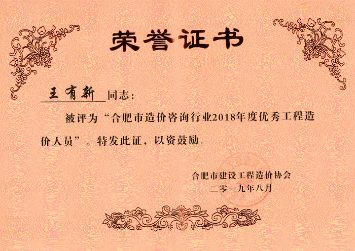 2018年度优秀造价人员--技术负责人王有新