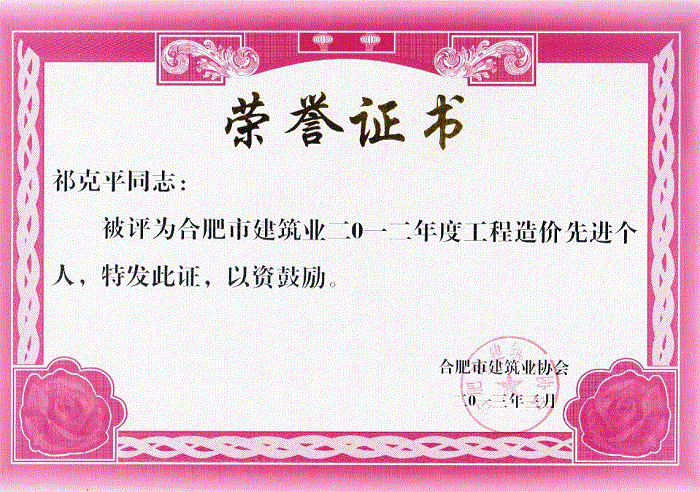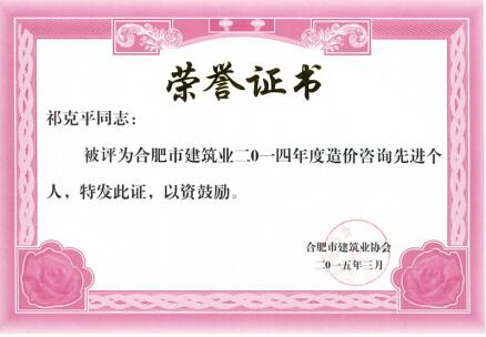 2014年度先进个人--二级造价师祁克平